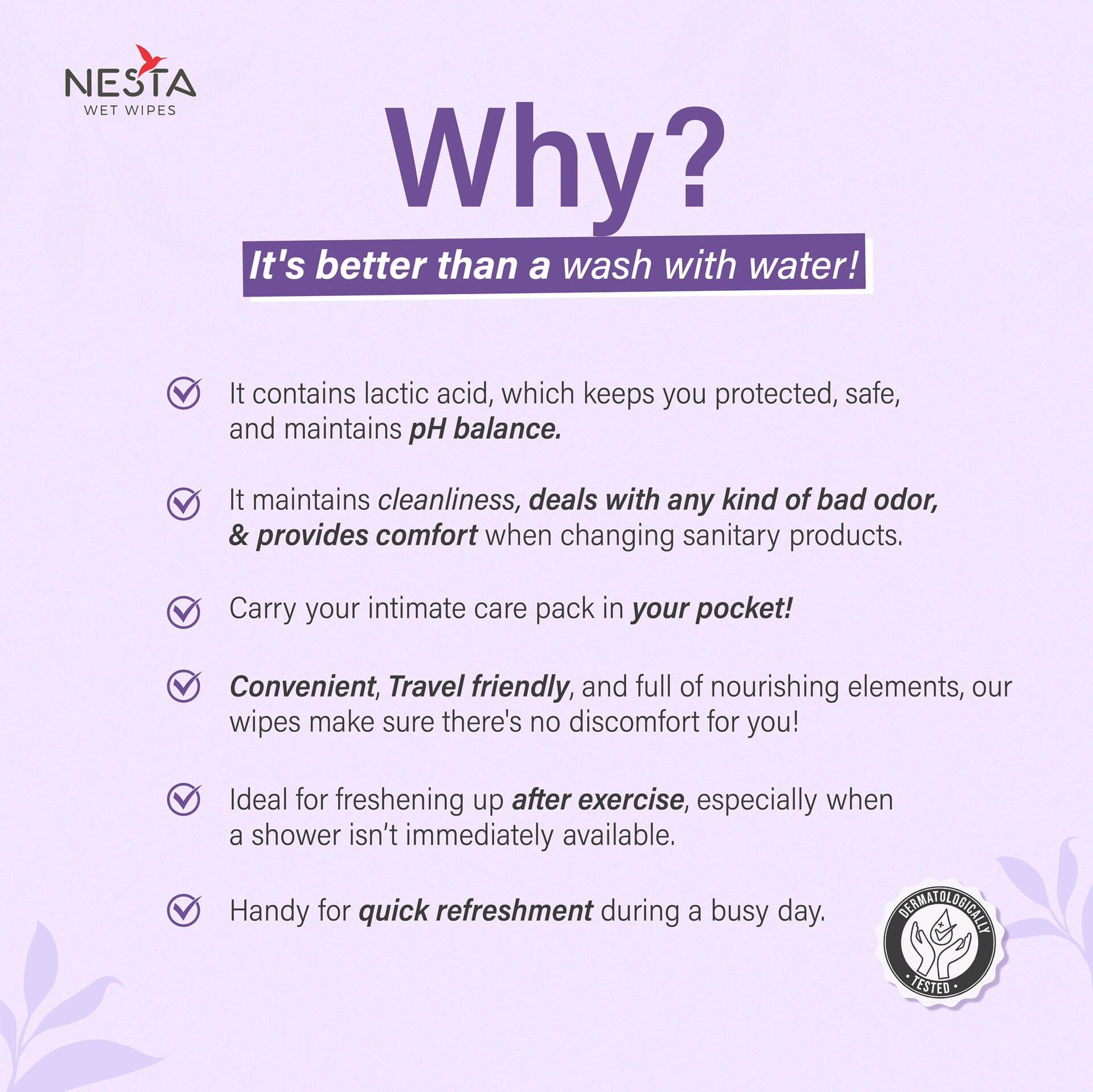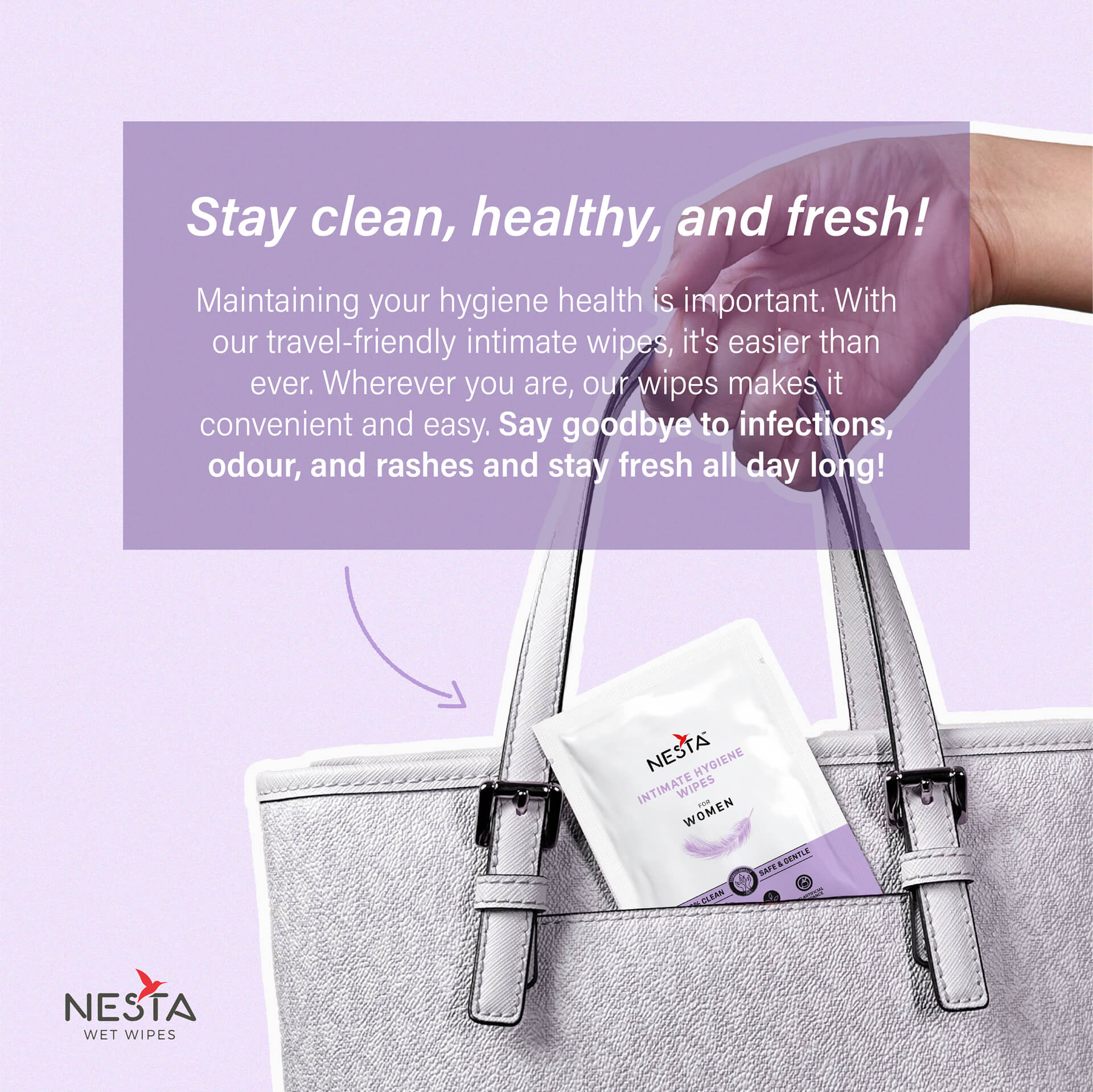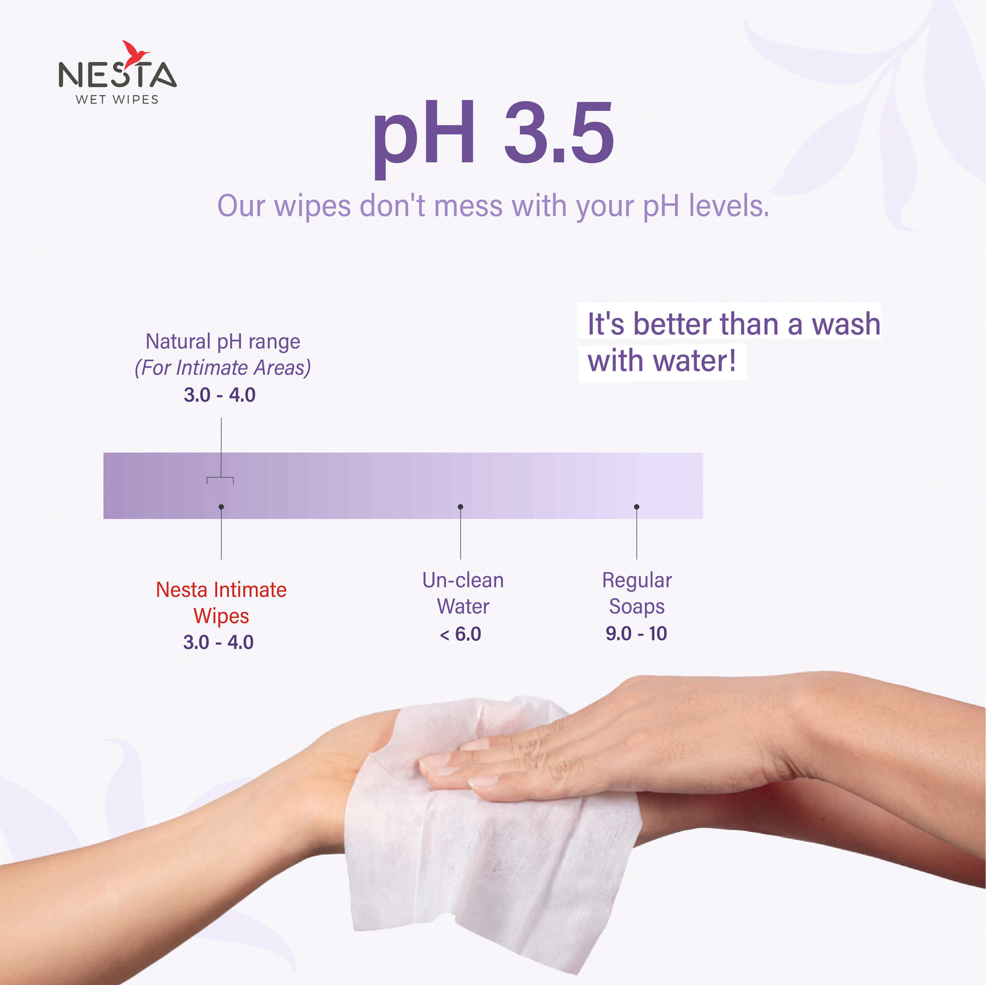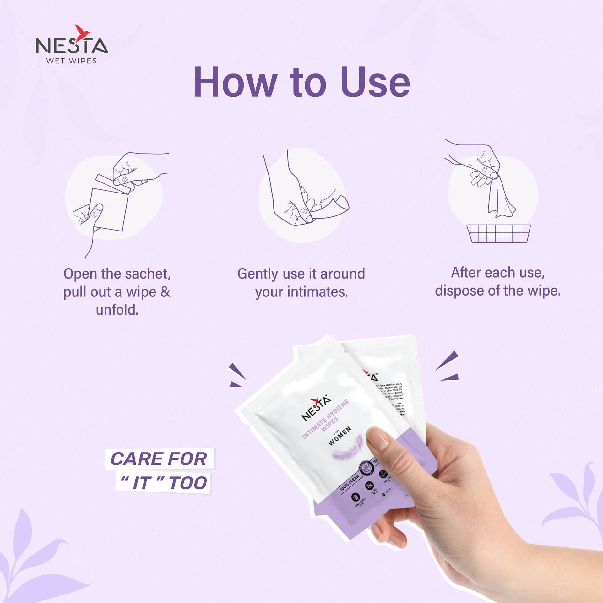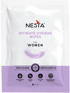NESTA Intimate wipes are enriched with hyaluronic acid, lactic acid and tea tree oil to maintain the hygiene and freshness of your intimate area. Hyaluronic acid helps in maintaining skin hydration, ensuring moisture retention without causing irritation. Lactic acid assists in maintaining the natural pH balance, supporting a healthy environment for intimate skin. Tea tree oil, known for its natural antibacterial and soothing properties. These wipes promise to be gentle and mild as they are free from synthetic fragrance and toxic chemicals.